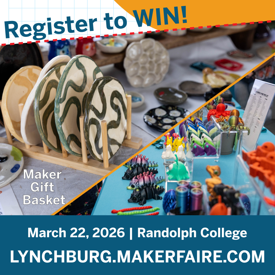 Register for Maker Faire Lynchburg and be entered to win a Maker Basket full of goodies from our 2026 exhibitors! Both pre-event and on-site registration will qualify as entries. Limit one entry per household. Maker Faire Lynchburg is Sunday, March 22, 2026 from 11am-5pm at Randolph College. Drawing will be made at the event on March 22nd. Registered persons must attend the Faire to be eligible to win.